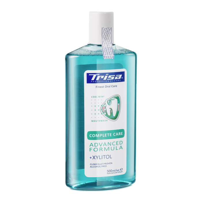 Apa de gura TRISA Complete Care, cu FORMULA AVANSATA unica si gust de menta racoritor, care contribuie la rutina completa de ingrijire a gurii.