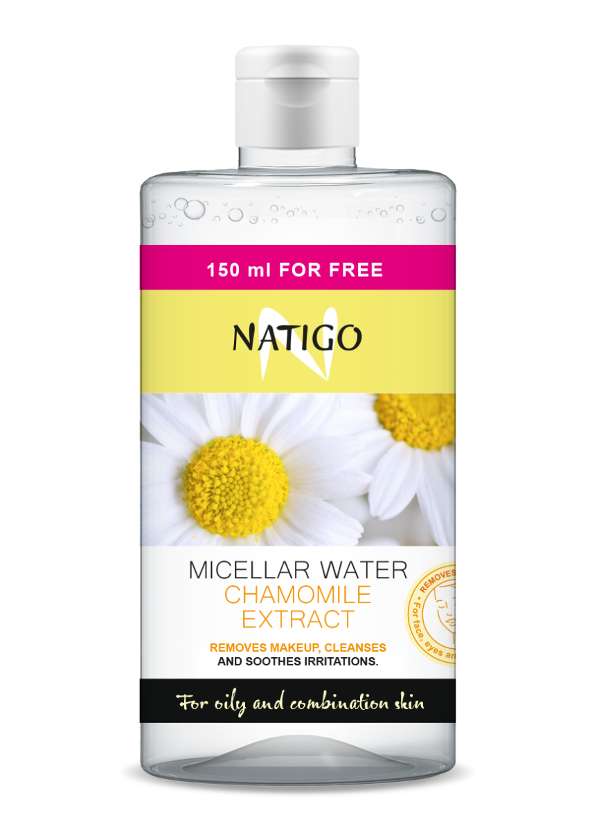 Apa micelara cu extract de musetel Natigo curata delicat, calmeaza pielea iritata si indeparteaza eficient machiajul.