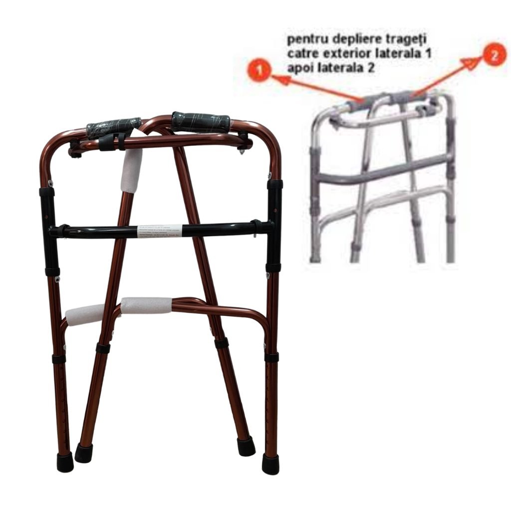 Cadrul de mers din aluminiu, pliabil, ruginiu este un dispozitiv ajutator pentru mers, care ofera stabilitate si echilibru in timpul deplasarii. Este confectionat din aluminiu, avand varful din material anti-derapant, reducand riscul de alunecare.