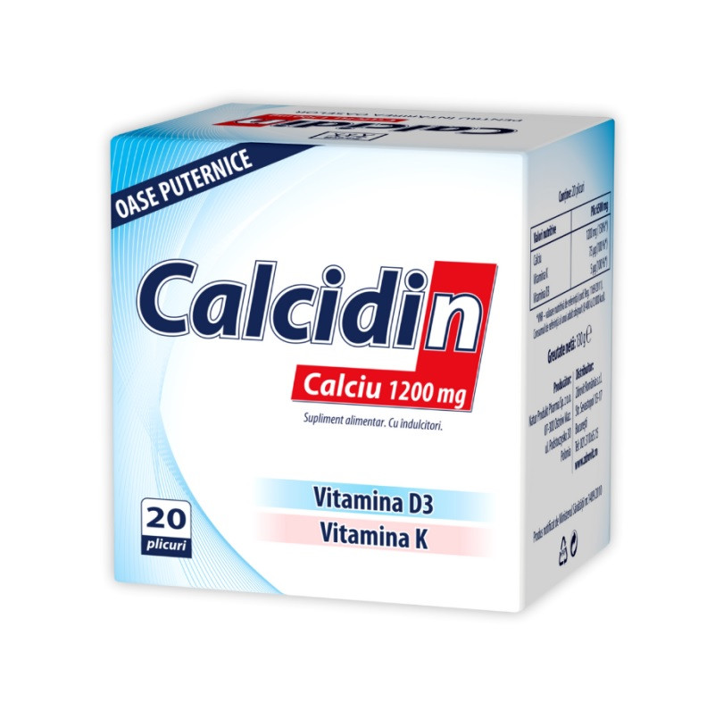 Calcidin 1200mg x 20 plicuri - Calciul este un component de baza al oaselor si dintilor, care influenteaza echilibrul electrolitic din organism