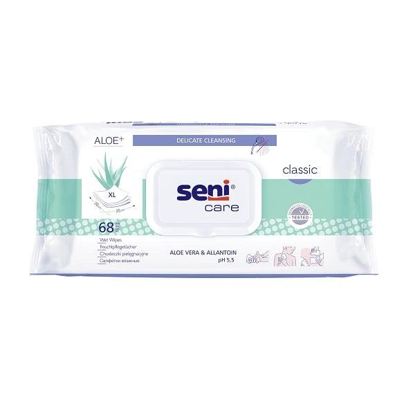 Servetelele umede Seni Care pentru curatarea usoara a pielii, in special in cazurile persoanelor cu incontinenta.