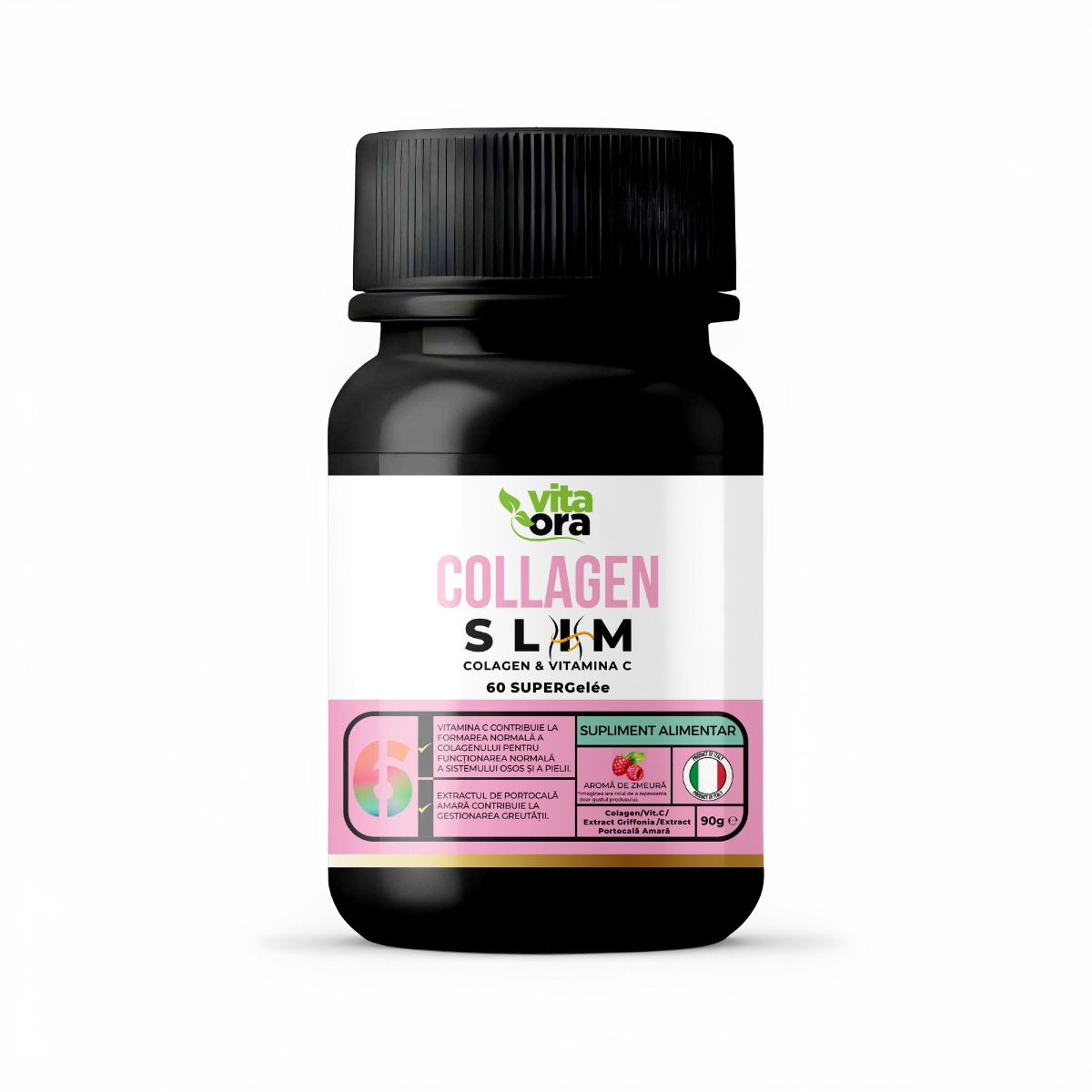 Collagen Slim, Vita Ora, este un supliment sub forma de jeleuri cu aroma de zmeura, ce sustine elasticitatea pielii, sanatatea parului si a unghiilor, echilibrul emotional si metabolismul, gratie colagenului hidrolizat, vitaminei C si extractelor vegetale.