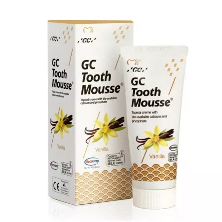 Crema topica Tooth Mousse cu aroma de Vanilie, 40 g, GC Descriere: Tooth Mousse este o cremă topică pe bază de apă, remineralizantă și fără zahăr, formulată cu Recaldent CPP-ACP (fosfopeptidă caseină - fosfat amorf de calciu). Aceasta restabilește echilibrul mineral în cavitatea bucală, protejează smalțul dinților și ajută la reducerea hipersensibilității dentare, oferind în același timp o protecție anti-cariogenică eficientă. Proprietăți cheie: Restabilește echilibrul mineral: ideal pentru pacienții cu xerostomie sau deficiențe salivare. Post-intervenții dentare: ajută după albire, detartraj profesional sau subgingival și reduce hipersensibilitatea dentară. Repară petele albe cretoase: poate transforma opacitatea în translucență naturală, asemănătoare dintelui. Protecție anti-cariogenică: inhibă demineralizarea smalțului și remineralizează zonele afectate. Sigură pentru toți: recomandată inclusiv femeilor însărcinate și copiilor sub 6 ani. Gust plăcut de vanilie: oferă o senzație de dinți mai fini și mai curați. Beneficii: Neutralizează atacurile acide ale bacteriilor din placa dentară și din alte surse. Reduce hipersensibilitatea dentinară prin obturarea tubulilor dentinari. Previne formarea cariilor incipiente. Recomandată în timpul și după tratamentele ortodontice. Sprijină sănătatea orală la pacienții cu risc cariogen scăzut spre mediu. Indicații: Xerostomie sau alte deficiențe salivare. După albirea dinților, detartraj sau alte proceduri dentare. Pacienți cu risc cariogen scăzut spre mediu. Femei însărcinate și copii sub 6 ani pentru protecție suplimentară a dinților. Hipersensibilitate dentară și prevenirea cariilor incipiente. Mod de utilizare: Aplicați crema pe dinți cu ajutorul unui deget curat sau al unei periuțe moi. Lăsați crema să acționeze timp de 3-5 minute. Nu clătiți imediat după utilizare, pentru a permite remineralizarea. Poate fi utilizată de mai multe ori pe zi, conform recomandărilor medicului dentist. Ingrediente active: Recaldent CPP-ACP (Fosfopeptidă caseină - fosfat amorf de calciu): eliberează calciu și fosfat pentru a restabili echilibrul mineral în mediul oral. Prezentare: Tub de 40 g , cu gust delicios de vanilie. Tooth Mousse – protecția și remineralizarea perfectă pentru zâmbetul tău!