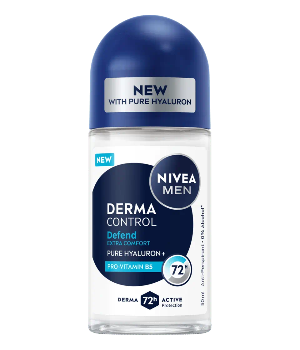 Nivea Men Derma Control Defend roll-on ofera 72h protecție, calmează iritațiile și hidratează pielea, datorită formulei cu acid hialuronic și provitamina B5.