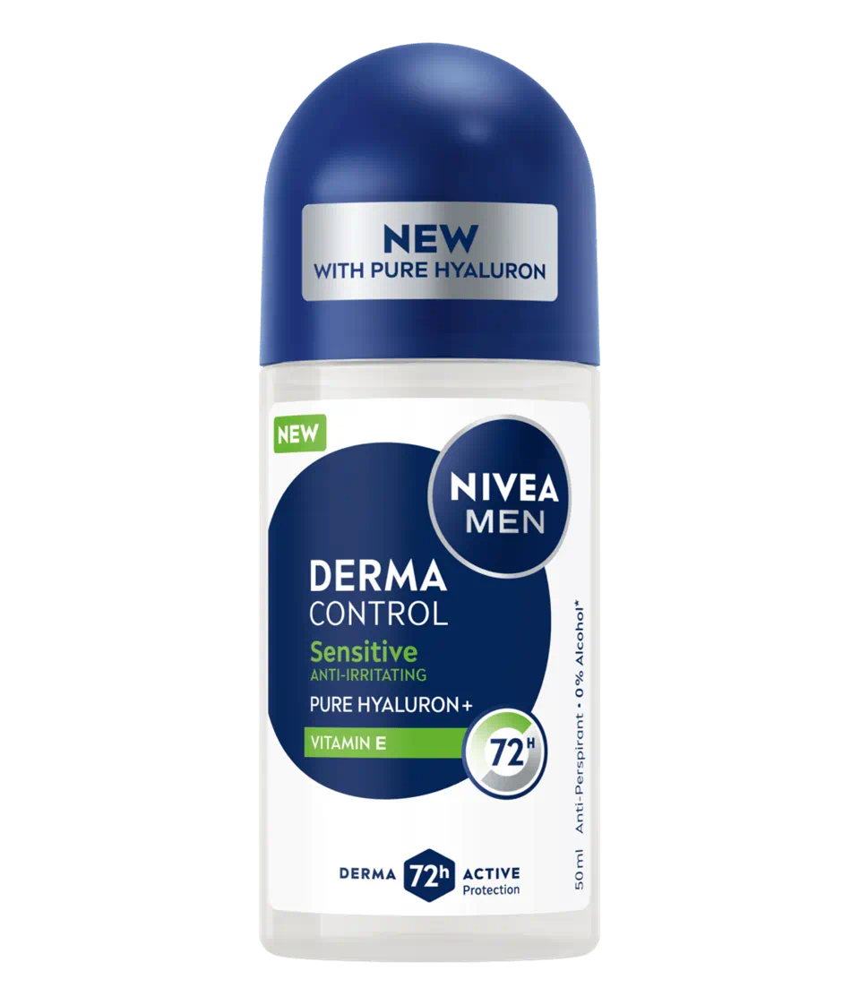 Nivea Men Derma Control Sensitive roll-on ofera 72h protecție, calmeaza iritatiile si hidrateaza pielea sensibila datorita acidului hialuronic si vitaminei E.