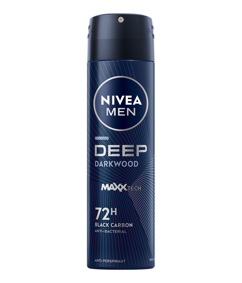 Deodorantul spray Nivea Men Deep Darkwood Black Carbon 150ml ofera protectie 72h, parfum masculin intens si formula MAXXTECH cu carbune negru.