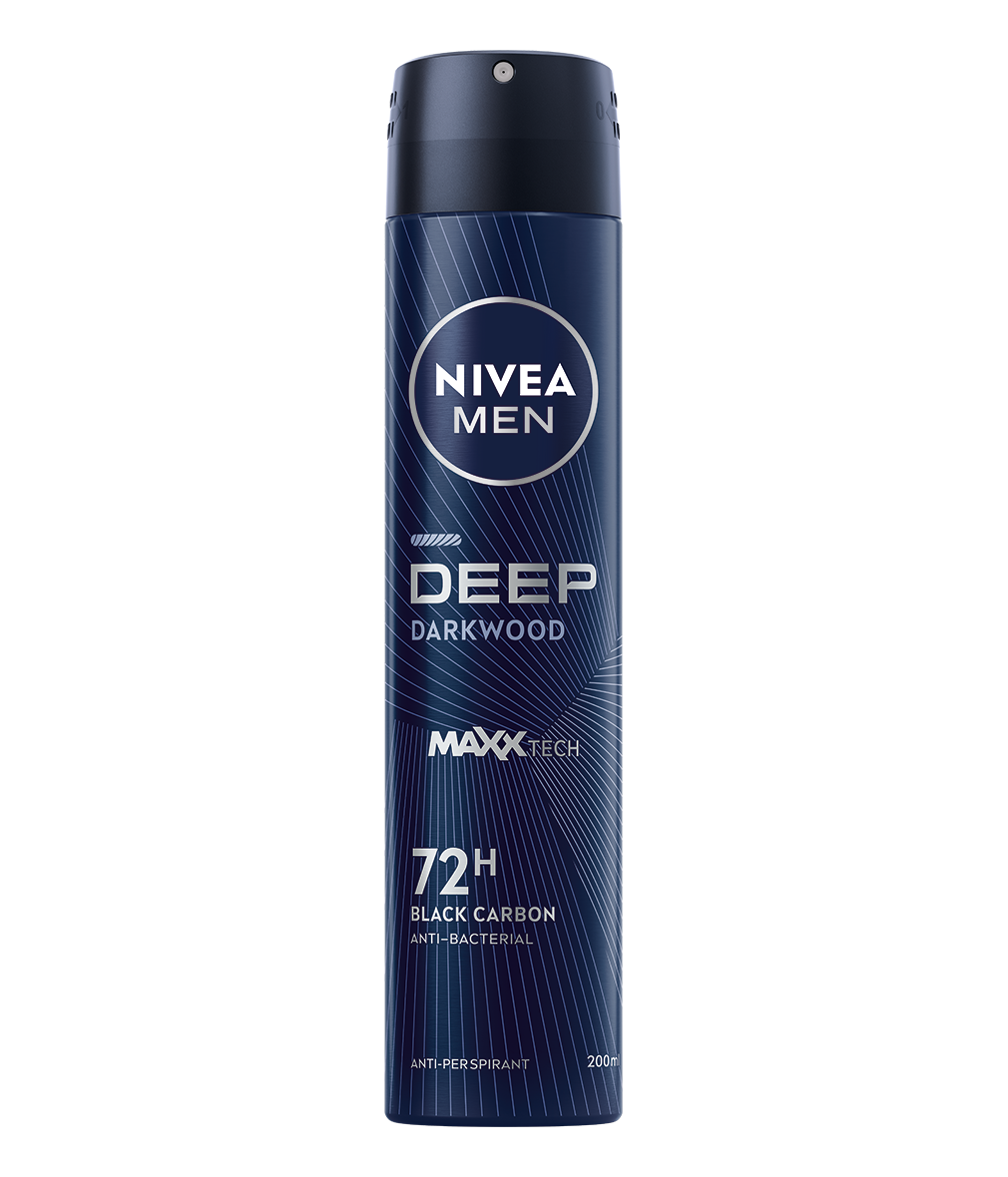 Deodorantul spray Deep Darkwood Black Carbon, 200ml, Nivea ofera protectie antiperspiranta 72h si parfum masculin intens, cu formula MAXXTECH cu carbune.