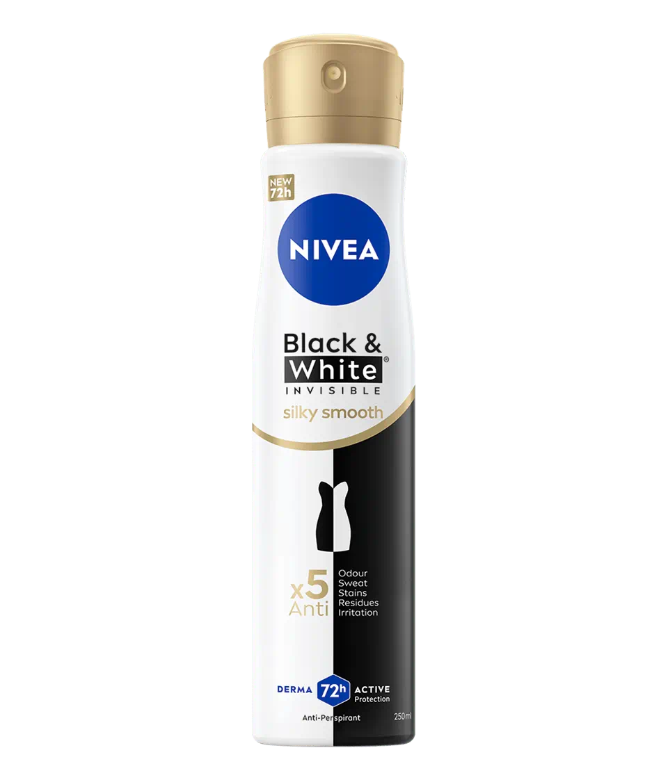 Nivea Black & White Silky Smooth 250ml protejeaza 72h, previne petele pe haine si lasa pielea catifelata, fara alcool etilic.