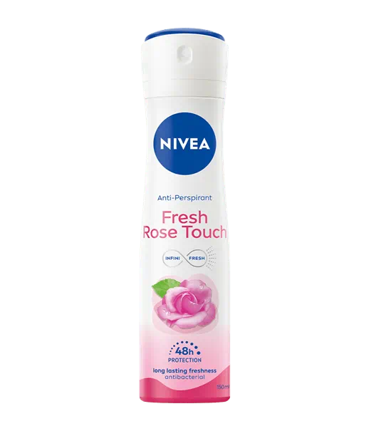 Nivea Fresh Rose Touch spray, 150ml, cu tehnologia Infinifresh, parfum de petale de trandafir, 48h protectie si 0% alcool etilic.