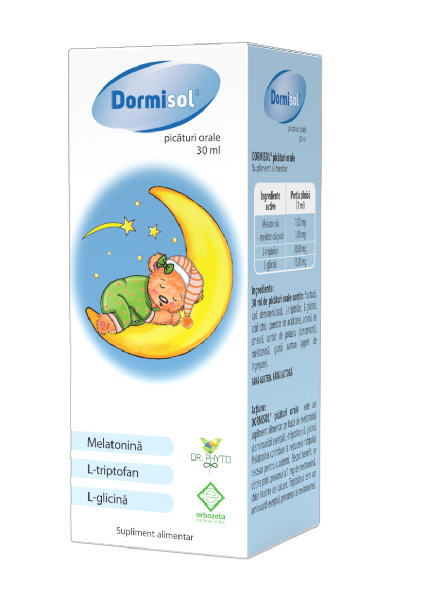 Dormisol picaturi orale este un supliment alimentar pe baza de melatonina si aminoacizii esentiali L-triptofan si L-glicina.