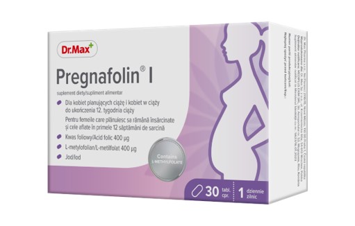 Dr. Max Pregnafolin I este un supliment alimentar ce contine acid folic, L-metilfolat si un complex de alte vitamine si minerale, destinat femeilor care planuiesc sa ramana insarcinate si celor aflate in primele 12 saptamani de sarcina.