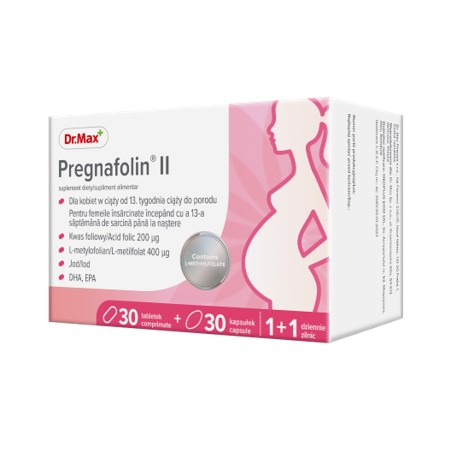 Dr. Max Pregnafolin II este un supliment alimentar ce contine acid folic, L-metilfolat, acizi grasi nesaturati omega-3 sub forma de DHA si EPA, si un complex de alte vitamine si minerale, destinat femeilor insarcinate incepand cu a 13-a saptamana de sarcina pana la nastere.