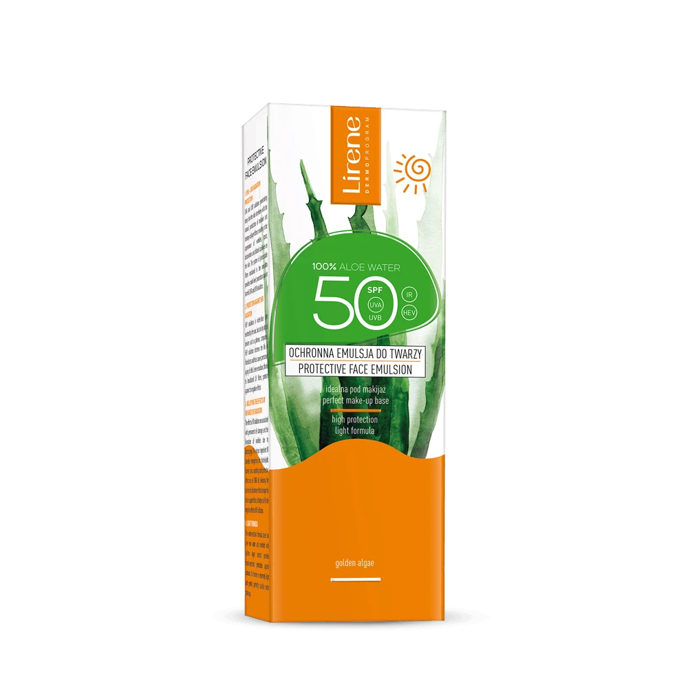 Emulsie cu Aloe Vera SPF50, Lirene, protejeaza pielea de UVA, UVB, HEV si IR, are textura usoara, vegana, hidrateaza si este ideala ca baza de machiaj zilnica.