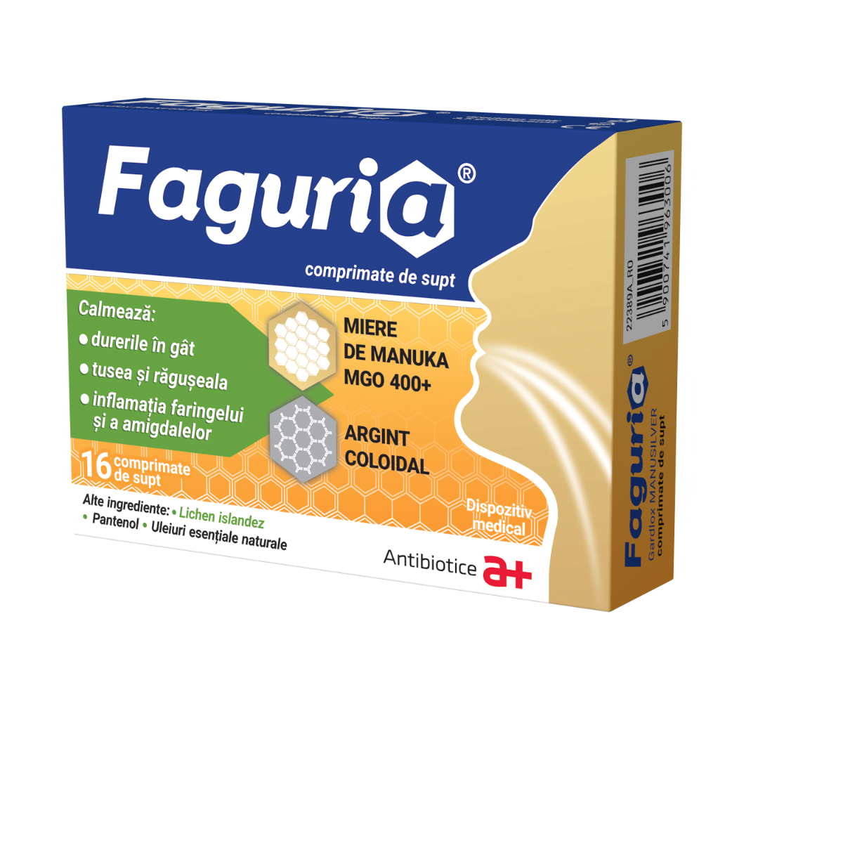 Faguria comprimate de supt, cu Miere de Manuka, lichen islandez si argint coloidal, calmeaza durerea in gat, tusea si raguseala, sustinand regenerarea mucoasei.
