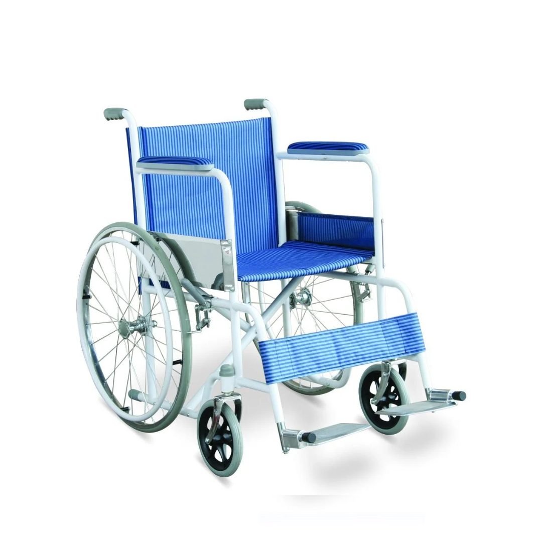 Fotoliu rulant manual economic, confectionat din otel suflat cu pudra de carbon pentru un aspect mat si protectie impotriva corodarii. Este prevazut cu doua cotiere fixe, moi, comode si suport pentru picioare, fiind confortabil pentru utilizator si usor de manevrat de apartinator.