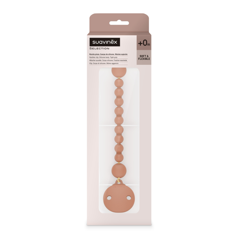 Lănțișorul din silicon Colour Essence, Ruby, de la Suavinex, este realizat din silicon medical moale și sigur, cu mărgele interconectate care previn riscul de sufocare. Clipsul practic fixează suzeta pe haina bebelușului, prevenind murdărirea sau pierderea. Oferă o experiență senzorială plăcută, sprijinind dezvoltarea copilului din primele luni. Fără BPA, fabricat în UE, și ambalat ecologic.