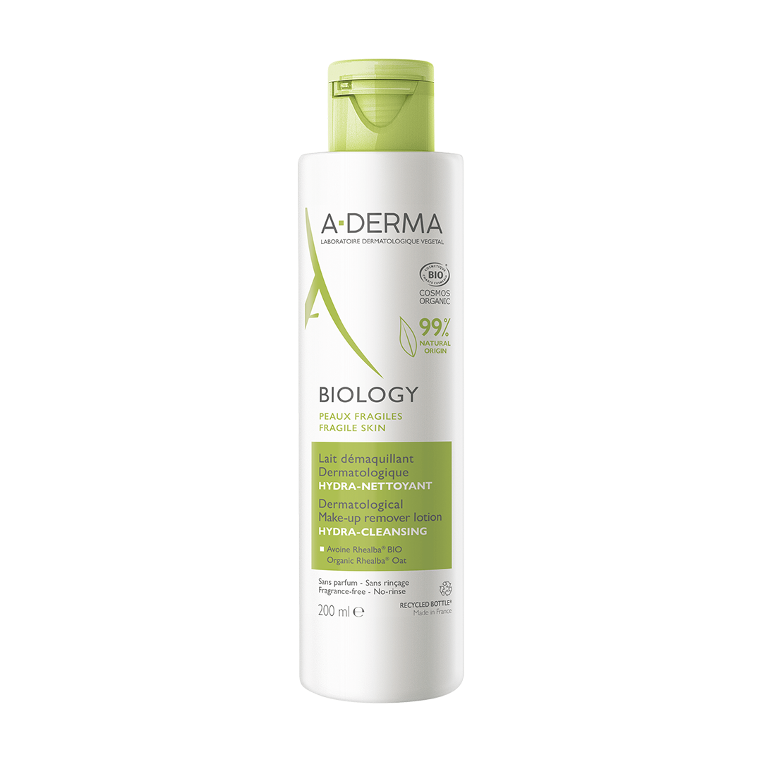 A-Derma a formulat BIOLOGY Lapte demachiant pentru a indeparta delicat si eficient machiajul si pentru a curata pielea fragila a fetei.