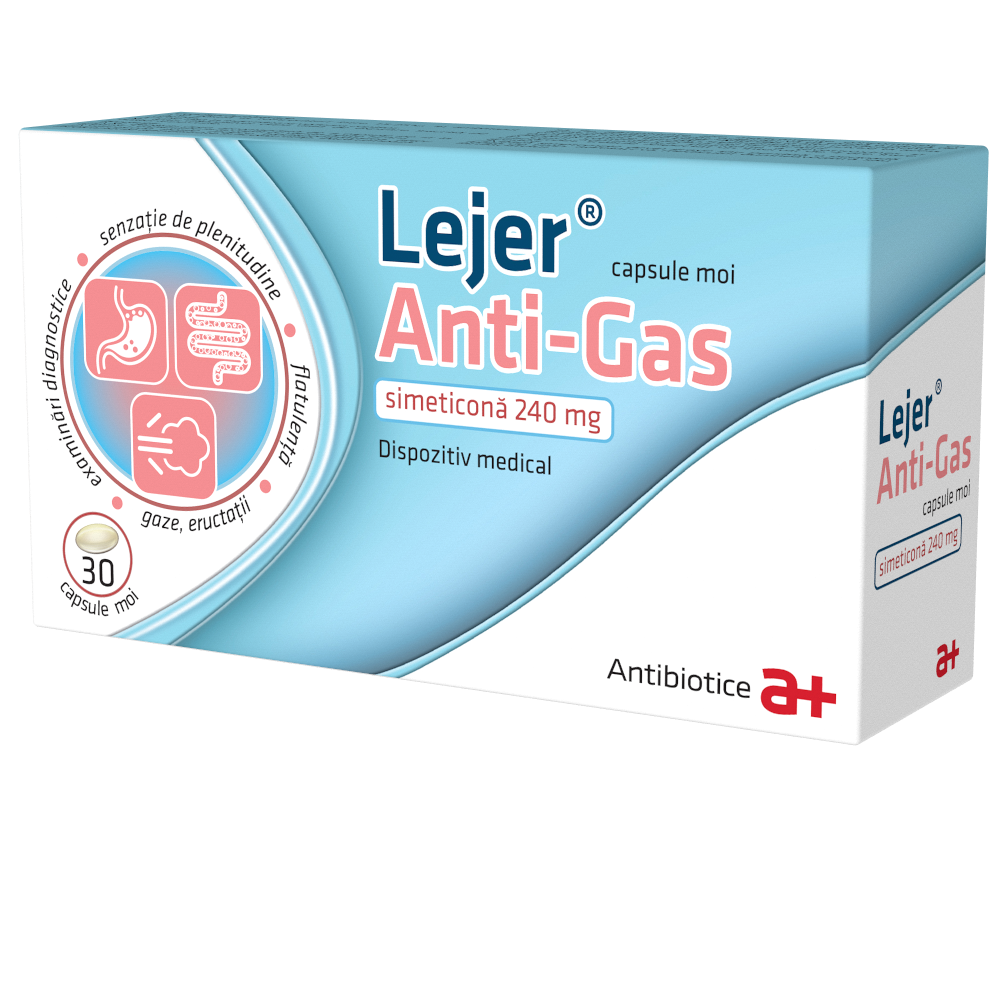 Lejer Anti-Gas reduce balonarea, disconfortul si senzatia de plenitudine abdominala, favorizand eliminarea gazelor intestinale prin actiunea simeticonei.