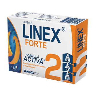 Linex Forte este un simbiotic modern (prebiotic + probiotic) cu actiune sinergica si complexa, care prin compozitia sa de culturi bacteriene vii poate
