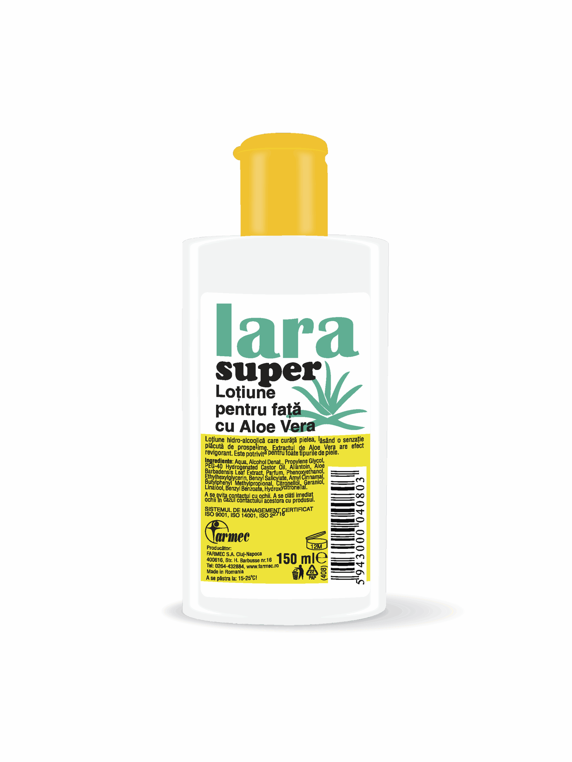 Loţiunea pentru faţă Lara este recomandată pentru toate tipurile de ten, fiind ideală pentru curăţarea şi tonifierea zilnică a tenului. Loțiunea încheie cu succes faza de curățare a tenului, asigură prospețime și curățarea în profunzime a pielii. Este o soluţie hidro-alcoolică destinată mai ales îngrijirii tenului cu exces de sebum, având efect tonifiant şi astringent. Datorită extractului de Aloe Vera, loţiunea are un efect revigorant, fiind potrivită pentru toate tipurile de piele.