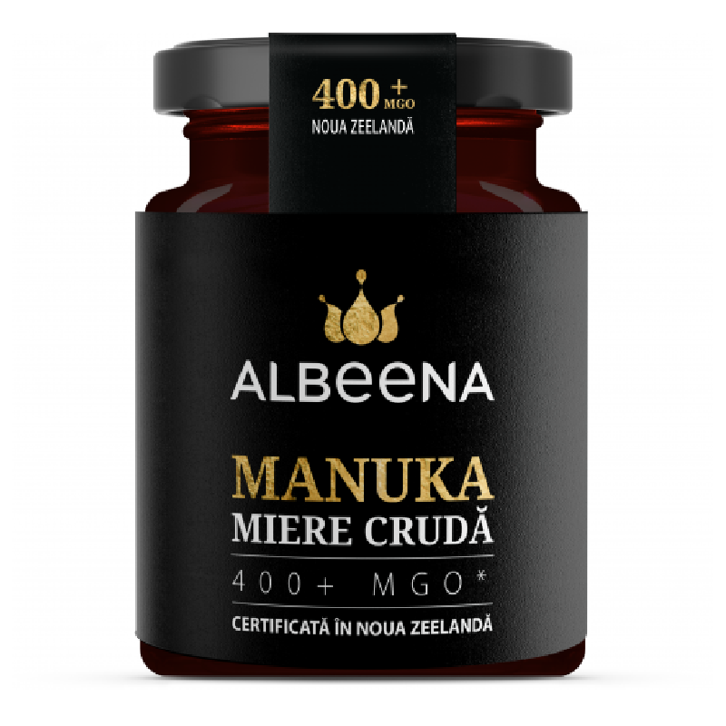 Albeena – Manuka/Miere Crudă cu 400 + MGO, Certificată în Noua Zeelandă - Superaliment natural pentru sănătateChiar dacă, în lume, există mai bine de 20.000 tipuri de miere, cel mai studiat dintre acestea, produsul cu grade terapeutice ridicate, rămâne Mierea de Manuka. Substanțele active ale acestui remediu antibacterian deosebit nu se regăsesc în alte sortimente. De aici și aprecierile pe care Mierea de Manuka și le-a câștigat de-a lungul timpului.
