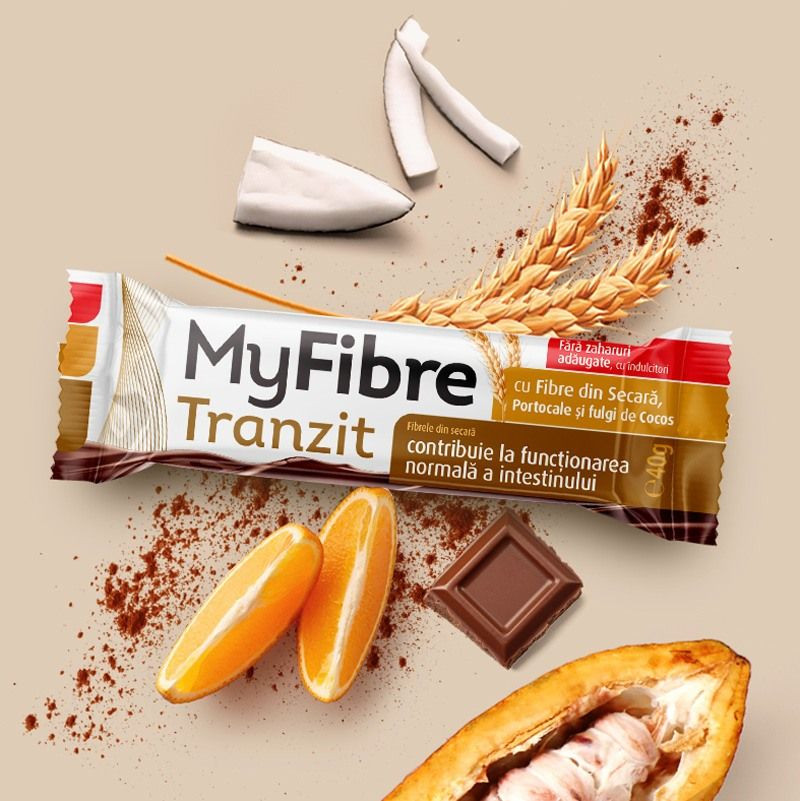 MYFIBRE Baton digestiv pentru tranzit intestinal, 40g – Sly Baton bogat in fibre pentru digestie usoara si tranzit optim Descriere produs MYFIBRE de la Sly este un baton functional, bogat in fibre solubile si insolubile, creat pentru a sustine digestia si a regla tranzitul intestinal. Ideal ca gustare sanatoasa, acest baton combina fibre din secara si polidextroza cu ingrediente atent selectionate, oferind un aport echilibrat de proteine si un continut redus de zaharuri. Beneficii principale Aport ridicat de fibre alimentare (7,3 g per baton) Sustine digestia si echilibrul intestinal Alternativa sanatoasa la gustarile dulci obisnuite Continut redus de zaharuri si proteine vegetale Potrivit pentru dietele bogate in fibre si controlul greutatii Compozitie principala Fibre din secara (14,4%) Sirop de polidextroza (fibre solubile) Izolat proteic din soia Pasta de arahide Fulgi de cocos (2%) Ulei esential de portocale (0,4%) Indulcitori: eritritol, maltitol, glicozide din Steviol Masa de cacao, pudra de cacao, lapte praf degresat Grasime din shea si palmier, unt de cacao Informatii nutritionale (per baton 40g) Valoare energetica : 135,1 kcal Grasimi : 5,6 g (din care acizi grasi saturati: 2,7 g) Glucide : 14,3 g (zaharuri: 2,8 g, polioli: 8,5 g) Fibre : 7,3 g Proteine : 6,9 g Sare : 0,14 g Mod de consum Se recomanda 1–2 batoane pe zi A se consuma cu 1–2 pahare de apa Consumul excesiv poate avea efect laxativ Prezentare Baton de 40 g
