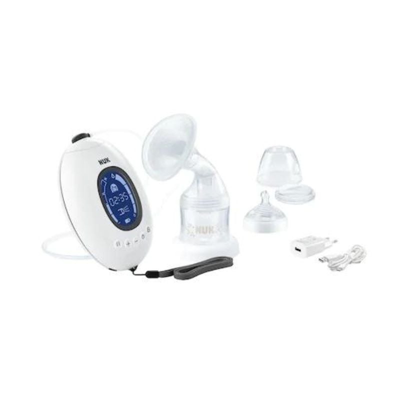 Laptele matern este cea mai buna hrana pe care o mama o poate oferi copilului ei in primele luni de viata. Exista situatii cand alaptatul trebuie intrerup pentru o perioada mai scurta sau lunga de timp. Bebelusii pot beneficia in continuare de hrana lor pretioasa multumita NUK Nature Sense Pompa de san electrica reincarcabila.Pachetul contine:1 NUK Recipient pentru lapte matern de 150 ml;1 tetina din silicon NUK Nature Sense cu trei orificii, varsta 0-6 luni (marime S pentru laptele matern si ceai);1 inel de insurubare;1 disc de etansare;1 capac;1 suport;1 adaptor AC;1 cablu USB;1 bretea practica pentru transport.