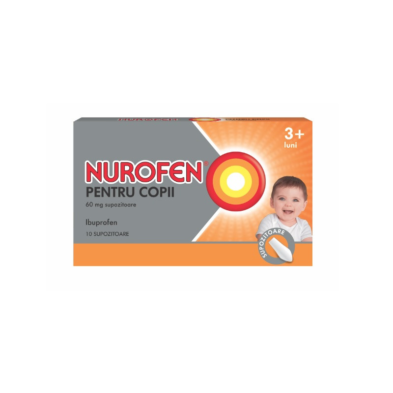 Nurofen pentru copii, 60mg, 10 supozitoare - Produs indicat in ameliorarea durerilor de cap, de dinți, de urechi, de gât, postoperatorii