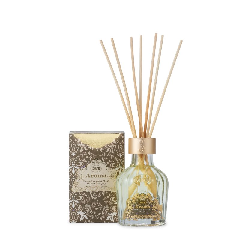 Parfum de camera Sabon Patchouli Lavender Vanilla, cu note orientale de paciuli, lavanda si vanilie, pentru un ambient cald, elegant si senzual.