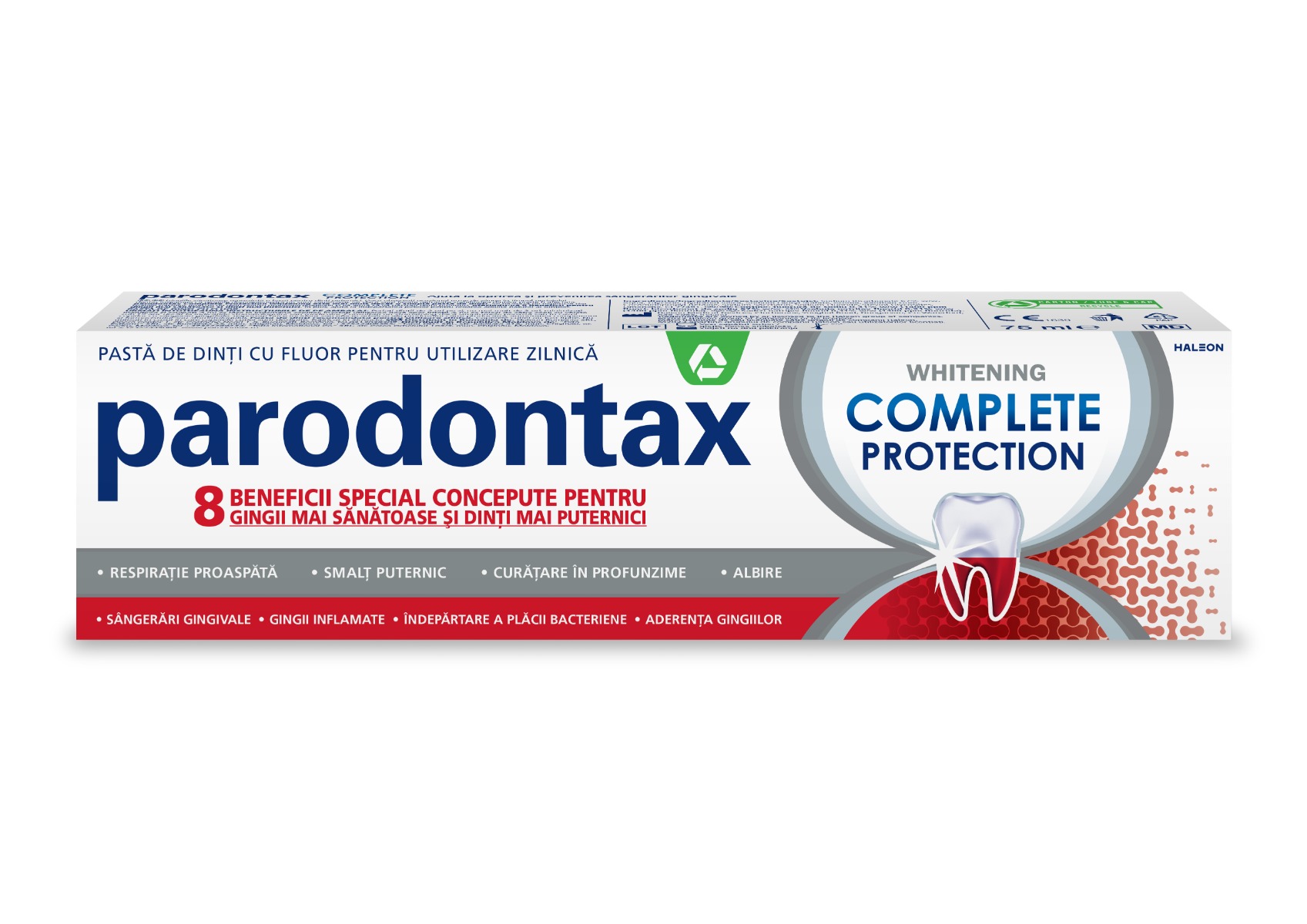 Pasta de dinti parodontax Complete Protection Whitening ajuta la mentinerea gingiilor sanatoase si a dintilor puternici avand 8 beneficii special cPasta de dinti parodontax Complete Protection Whitening ajuta la mentinerea gingiilor sanatoase si a dintilor puternici avand 8 beneficii special concepute in acest sens. Mai mult, ajuta la redarea albului natural al dintilor prin indepartarea delicata a petelor de pe suprafata acestora.oncepute in acest sens.