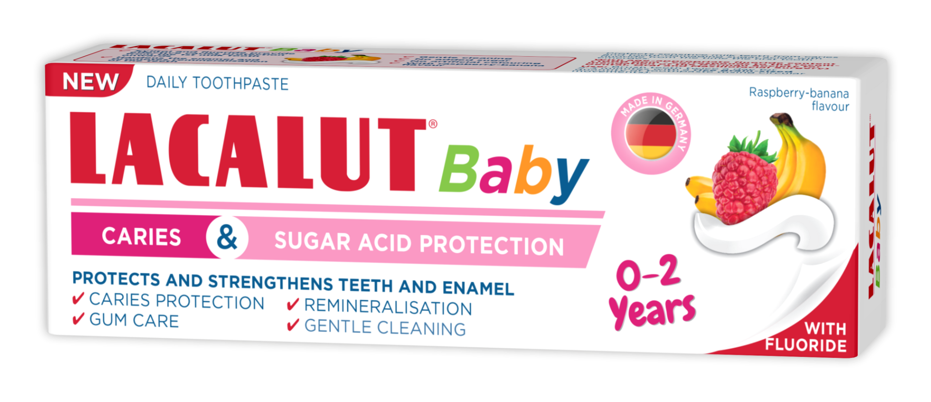 Inca de la prima eruptie, datorita fluorurii, pasta de dinti protejeaza dintii sensibili de lapte impotriva cariilor dentare si acizilor din zahar care dauneaza dintilor.