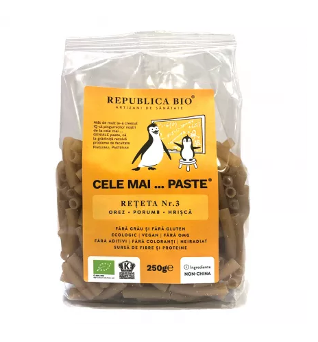 Acest produs Paste Reteta 3 orez, porumb si hrisca eco fara gluten, 250g, Republica Bio din categoria Dieta si nutritie se poate comanda online la un pret redus.
