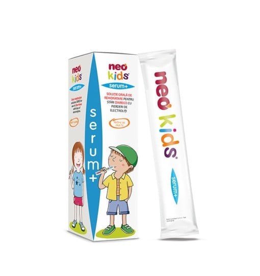 Serum+ Saruri Rehidratare 50 ml, 5 plicuri – Neo Kids Serum+ este un ser de rehidratare orala sub forma de plicuri unidoza, conceput pentru completarea lichidelor si electrolitilor pierduti prin diaree, varsaturi, febra sau transpiratie excesiva. Potrivit pentru toate varstele, inclusiv pentru sugari. Indicatii: Produs recomandat in cazuri de: deshidratare usoara pana la moderata diaree si varsaturi febra sau transpiratie intensa completarea electrolitilor dupa efort fizic sau expunere la caldura Ingrediente: Glucoza monohidrat Saruri minerale (clorura de sodiu, clorura de potasiu) Indulcitori Mod de administrare: Se administreaza 1 plic la fiecare 3 ore, in functie de necesitati. Doza maxima recomandata: 9 plicuri pe zi. Poate fi administrat la temperatura camerei, rece sau congelat. Potrivit pentru sugari, copii si adulti. Prezentare: Cutie cu 5 plicuri unidoza a cate 50 ml. Categorie: Soluții rehidratare orala, saruri electrolitice, produse pentru diaree si varsaturi.