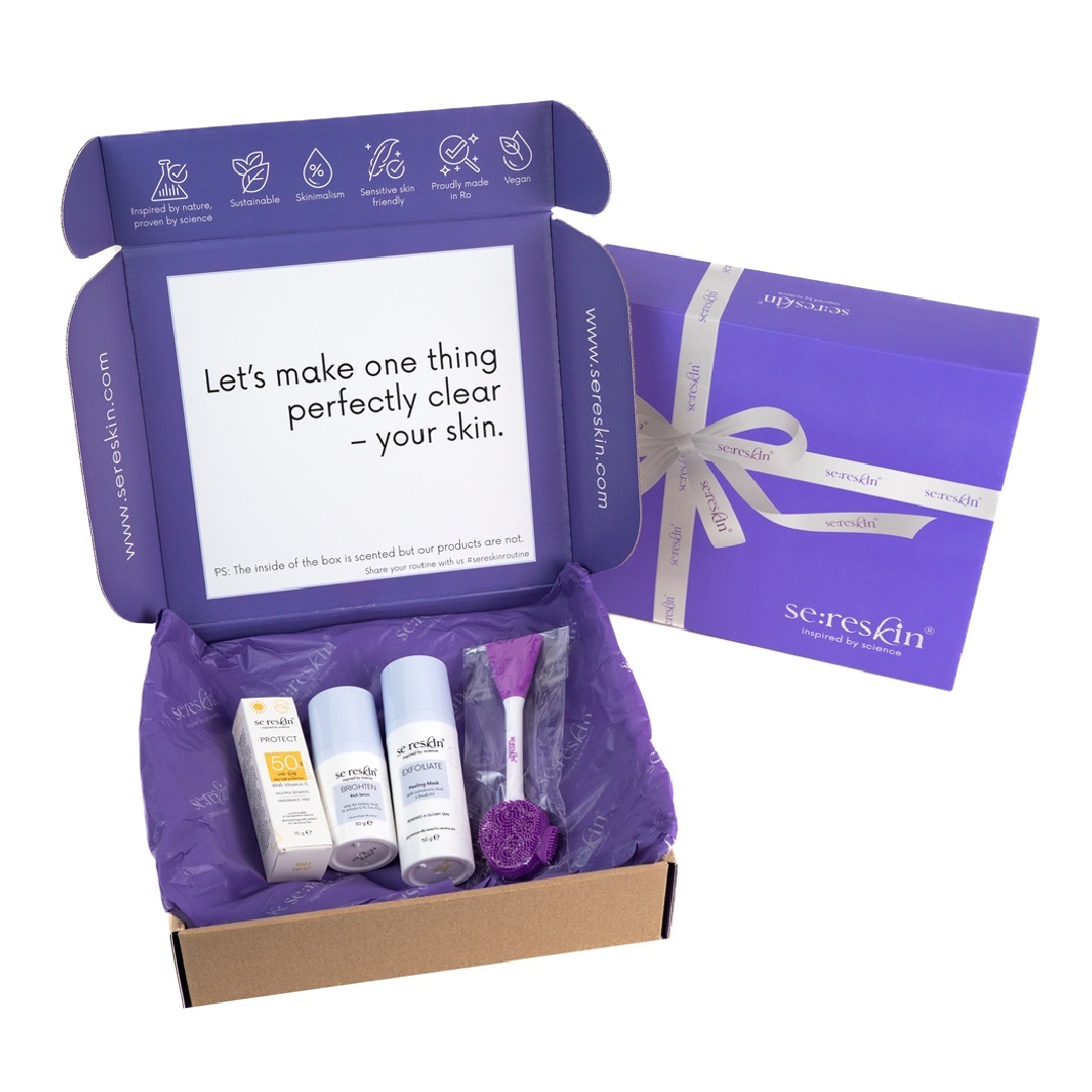 Setul Se:Reskin combina trei etape esentiale pentru un ten luminos, uniform si curat: ser iluminator Brighten, masca exfolianta Exfoliate si crema SPF 50+ in format mini, insotite de o pensula profesionala pentru aplicarea mastii. Este o rutina completa pentru reducerea petelor pigmentare, reglarea sebumului, exfolierea blanda si protectia zilnica impotriva radiatiilor UV.