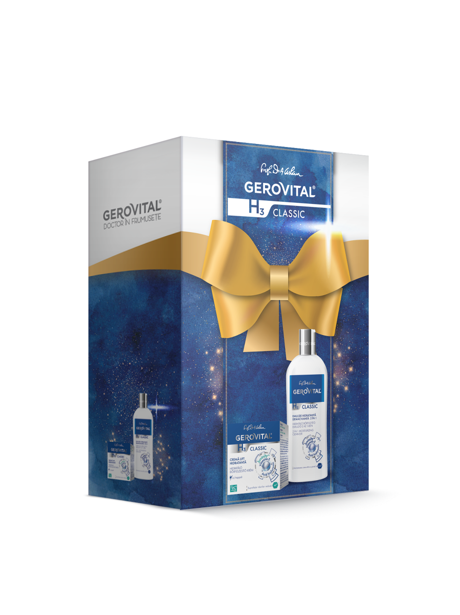 Acest set cosmetic include două produse din gama Gerovital H3 Prof. Dr. Ana Aslan Classic, ideale pentru rutina zilnică de îngrijire a tenului matur, uscat, ridat: o Cremă de zi hidratantă și un Demachiant emolient. Crema este special concepută pentru tenul deshidratat și lipsit de elasticitate, oferind un efect antirid vizibil, contribuind la redobândirea fermității pielii și îmbunătățind tonusul acesteia. Emulsia Hidratantă Demachiantă 2 în 1 curăță în profunzime și tonifică tenul, oferind o hidratare intensă dat...