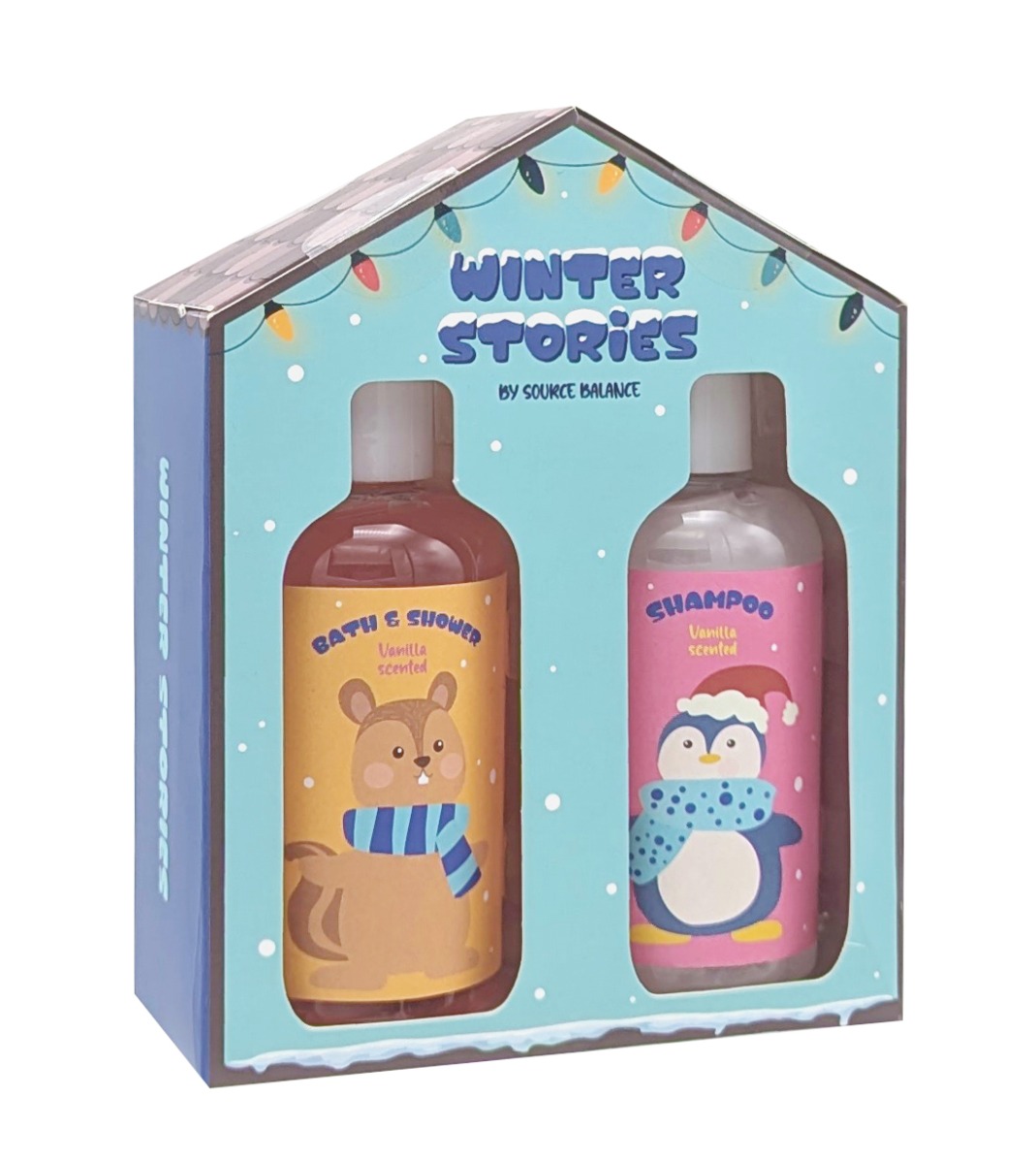 Set cadou Winter Stories cu gel de dus si sampon, ideal pentru ritualuri de ingrijire si momente relaxante in sezonul rece. Treffina.