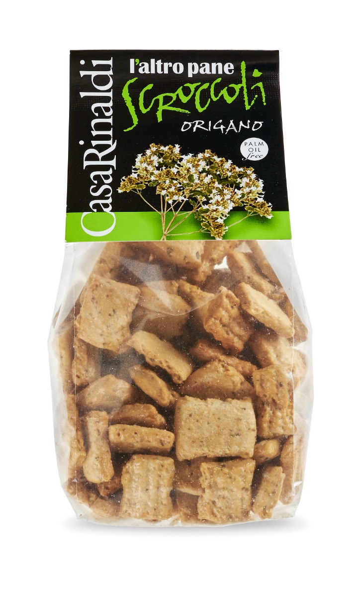 Snack cu oregano Scroccoli Casa Rinaldi, crocant si aromat, inspirat din reteta traditionala a taralli-lor pugliezi, cu gust mediteranean autentic.
