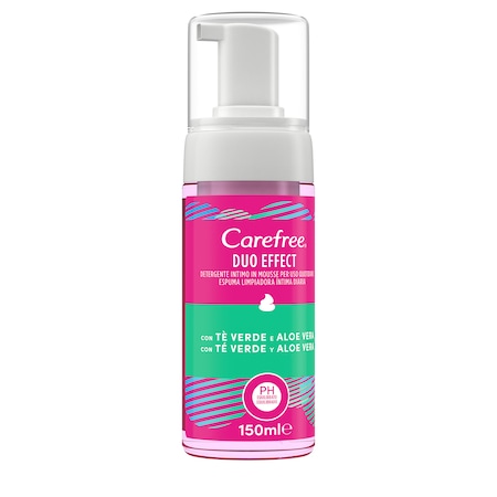 Spuma pentru igiena intima Carefree® Duo Effect cu ceai verde si aloe vera este special conceputa pentru a reimprospata si ingriji delicat zona intima, datorita texturii sale usoare si fine.