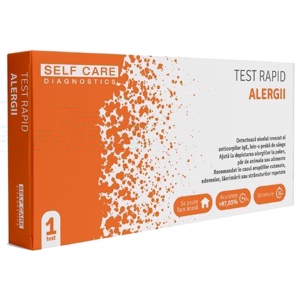 Testul rapid pentru alergii este un test imunologic, specific, usor de facut acasa, in orice moment al zilei. Depisteaza in 10 minute, intr-o picatura de sange, nivelurile ridicate ale Imunoglobulinei E (IgE). Persoanele care prezinta diverse sensibilitati alergice (la polen, la par de animale sau la unele alimente) au niveluri foarte mari de anticorpi IgE.Pentru mai multe detalii consultati sectiunea de Prospect.