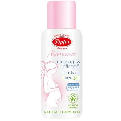Topfer Mamacare ulei corp-masaj x100mlUlei de corp pentru masaj Topfer Mamacare. Cu ulei organic de Argan. Masajul regulat cu uleiul de corp va preveni aparitia vergeturilor. Mod de utilizare: Aplicati uleiul intr-o cantitate generoasa pe pielea inca umeda de cateva ori pe zi, pe abdomen, coapse, fese si sani masand usor. Cosmetice naturale certificate BDIH. Cu tarate de grau organic. Cu uleiuri organic de argan si ulei organic de masline. Fara parfum. 98% din materiale prime organice.