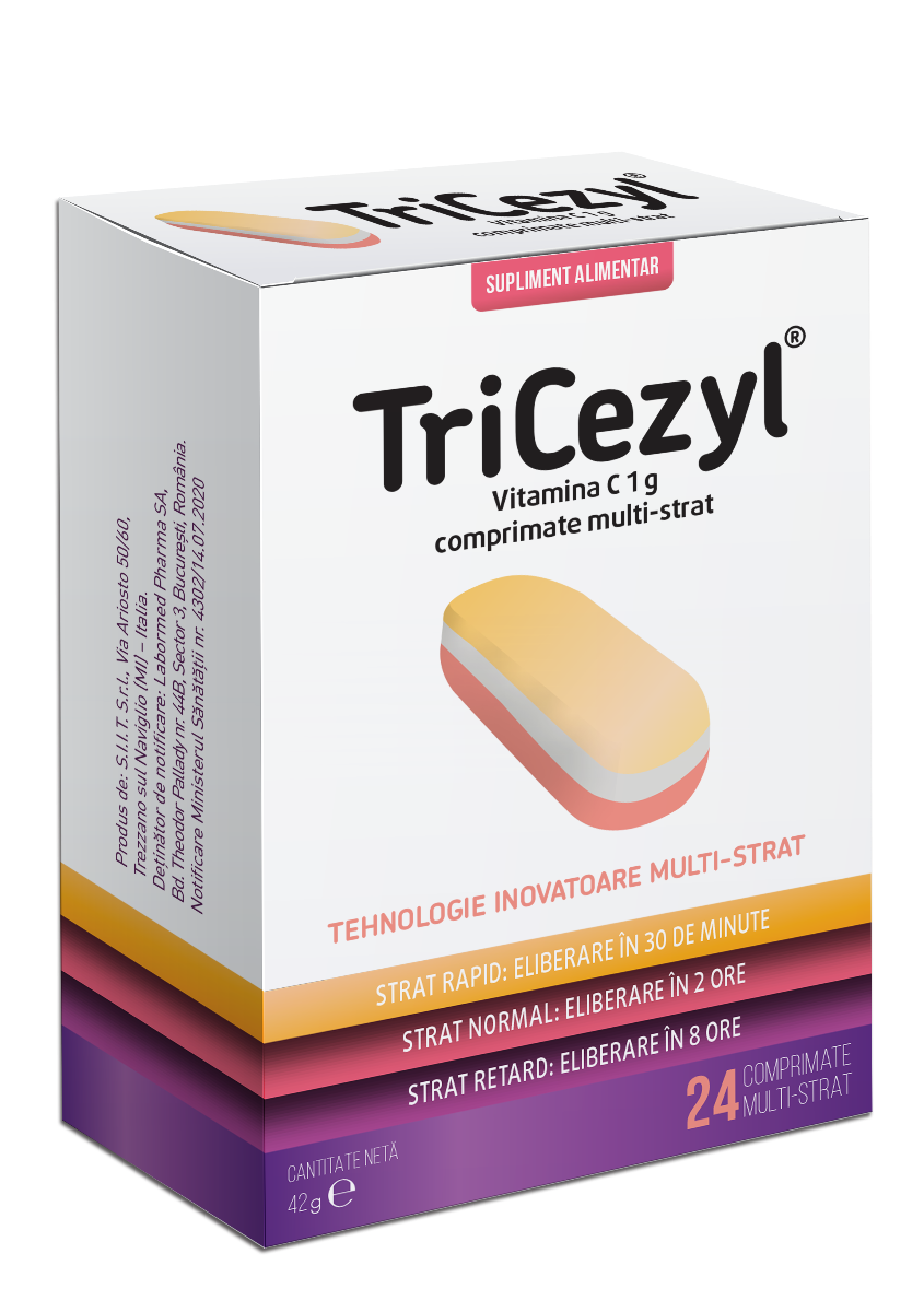 Tricezyl este un produs inovator cu Vitamina C 1 g, singurul din piata cu eliberare prelungita pana la 8 ore datorita tehnologiei de comprimat multi-strat.