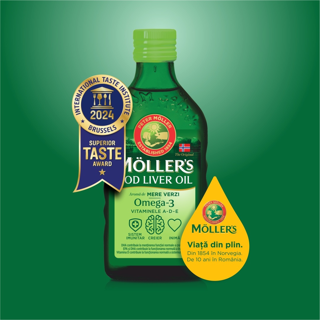 Ulei din ficat de cod Omega 3, Vitamina A-D-E, aroma mere verzi, 250 ml, MollerS Ulei din ficat de cod Omega 3, Vitamina A-D-E, aroma mere verzi Ajută la menținerea sănătății! 1 lingurița (5 ml) de ulei de ficat de cod MÖLLER’S cu aromă de mere verzi conține 1,2 g acizi grași naturali Omega-3 din peste (DHA + EPA) și vitaminele A, D (400 UI) și E. Pentru copii de peste 11 ani și adulți se recomandă 10ml/zi, asigurând 2,4 g (2400 mg) acizi grași naturali Omega-3 din peste (DHA + EPA) și vitaminele A, D (800 UI) și E. EPA și DHA contribuie la funcționarea normală a inimii*. DHA contribuie la menținerea vederii normale și a funcției normale a creierului**. Vitamina D contribuie la funcționarea normală a sistemului imunitar și la menținerea sănătății sistemului osos și a dinților. Vitamina A contribuie la funcționarea normală a inimii și a sistemului imunitar, la menținerea vederii normale și la menținerea sănătății pielii și a membranelor mucoase Vitamina E contribuie la protejarea celulelor împotriva stresului oxidativ. Pentru o dezvoltare completă, fiecare picătură contează! Uleiul de ficat de cod Möller’s conține în special DHA. Este dovedit clinic că DHA contribuie la dezvoltarea cerebrală normală și a vederii. Vitamina D ajută la absorbția și utilizarea normală a calciului, contribuind astfel la menținerea unui sistem osos normal. * efectul benefic se obține în condițiile unui consum zilnic de 250 mg EPA și DHA ** efectul benefic se obține în condițiile unui consum zilnic de 250 mg DHA Mod de administrare: Copii: 5 ml/zi Copii de peste 11 ani și adulți: 10 ml/zi Conform recomandării producătorului, uleiul de ficat de cod se poate folosi în siguranță în timpul sarcinii și al alăptării. Prezentare: 250 ml