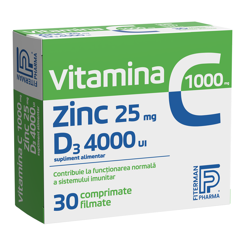 Acest produs Vitamina C 1000mg + Zinc 25mg + D3 4000UI, 30 comprimate, Fiterman din categoria Suplimente alimentare se poate comanda online la un pret redus.