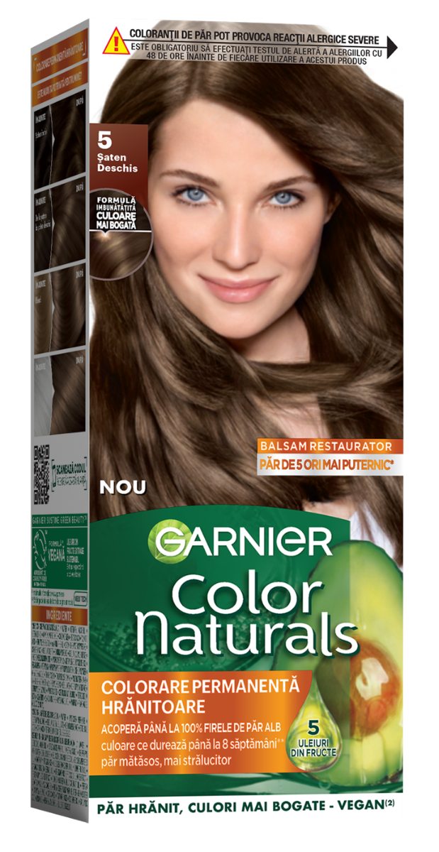 Vopsea de par permanenta Color Naturals 5 Saten Deschis, 112ml, Garnier ofera o nuanta naturala de saten deschis, acoperire completa a firelor albe si culoare intensa de lunga durata.