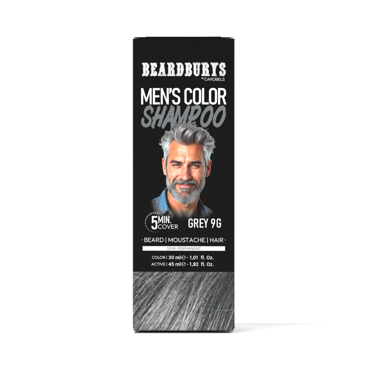 Sampon colorant semipermanent Grey 9G, Beardburys, pentru par, barba si mustata, acopera firele albe progresiv, fara amoniac, pentru un rezultat natural.